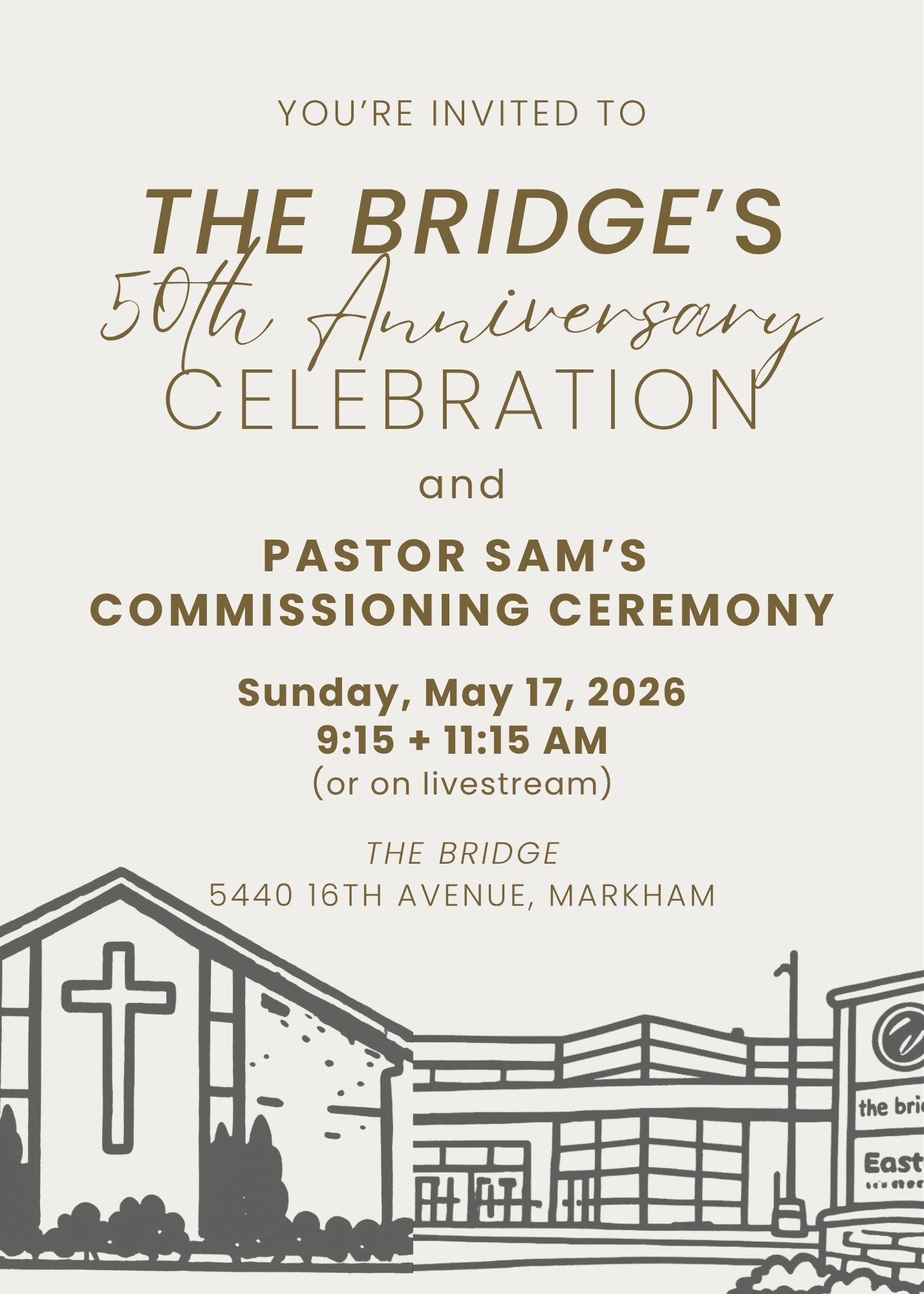 It’s been 50 years since the very first service of what was known back then as Markham Pentecostal Church. Come to the bridge at 5440 16th Avenue for service at 9:15am or 11:15am (or online!) on Sunday, May 17, for a special celebration. We will be taking a look back at all that God has done through the bridge over the last half century and look forward expectantly to all that He will continue to do.